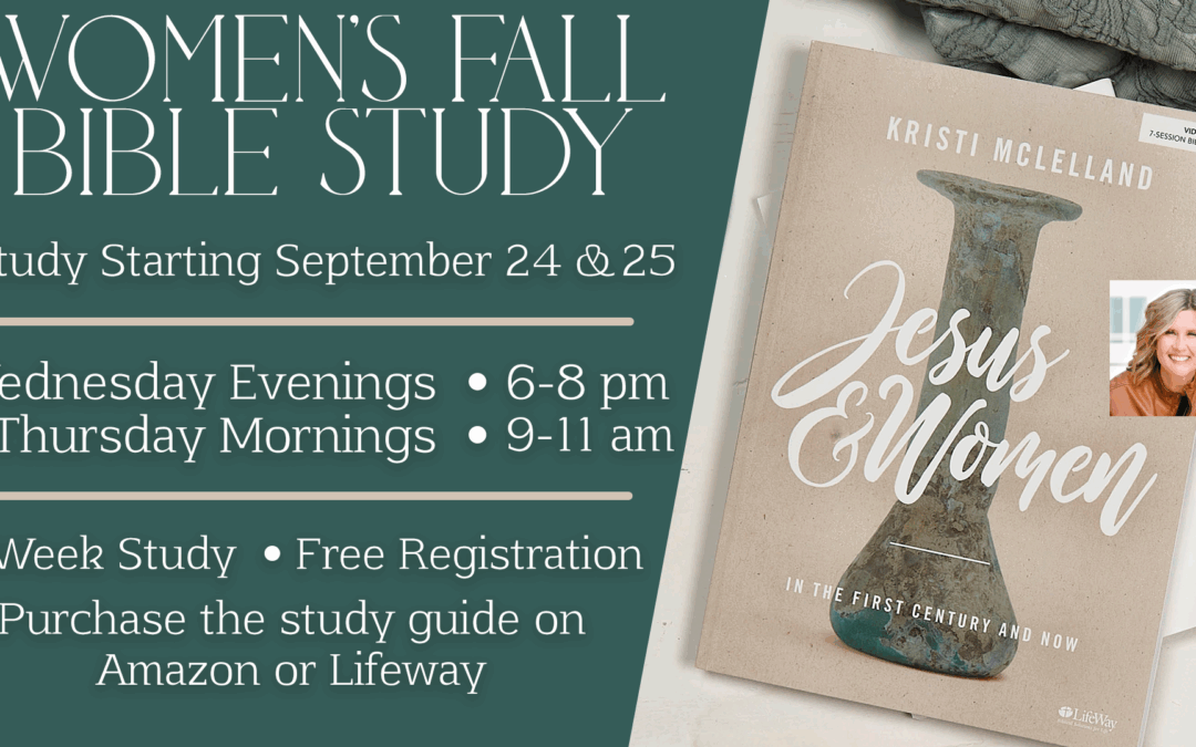 Join us this fall as we grow in God’s Word together through fellowship, prayer, and community! We’ll be studying Jesus and Women by Kristi McLelland, a seven-session Bible study that takes us back to the world of first-century Galilee. Through history, culture, and scripture, we’ll gain a deeper understanding of Jesus and be reminded of His love for us today. The study will begin on Wednesday, September 24, or Thursday, September 25, and will run for eight weeks, ending November 19 and 20. We will not meet the week of October 15 and 16 during fall break. Wednesday evenings will meet from 6–8 PM, and Thursday mornings will meet from 9–11 AM, with childcare provided on Thursday mornings at no cost.